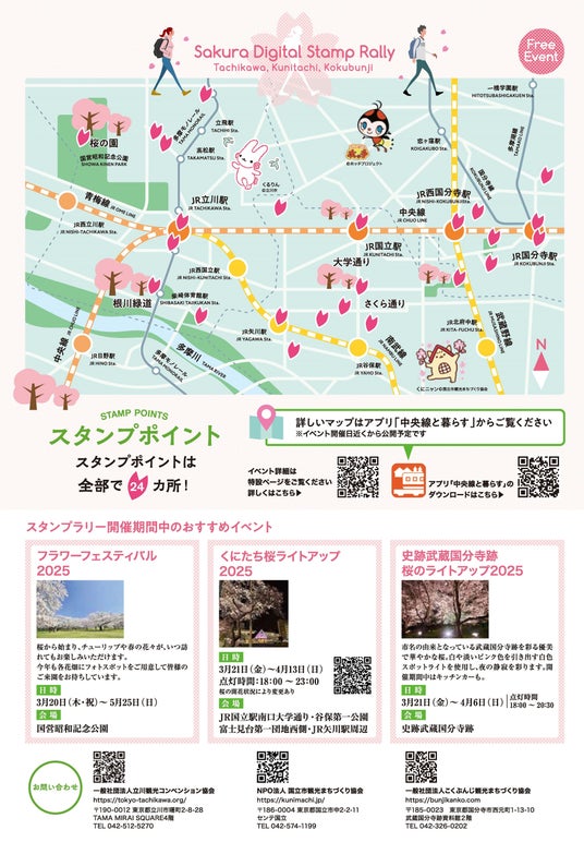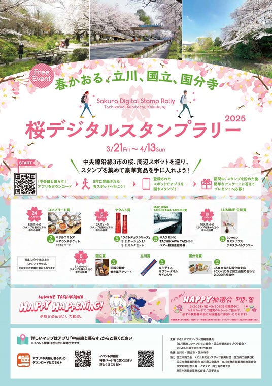 まるたまプロジェクト連絡協議会は3月21日~4月13日、3市の桜スポットと周辺スポットを巡る「春かおる、立川、国立 国分寺 桜デジタルスタンプラリー」を実施します。