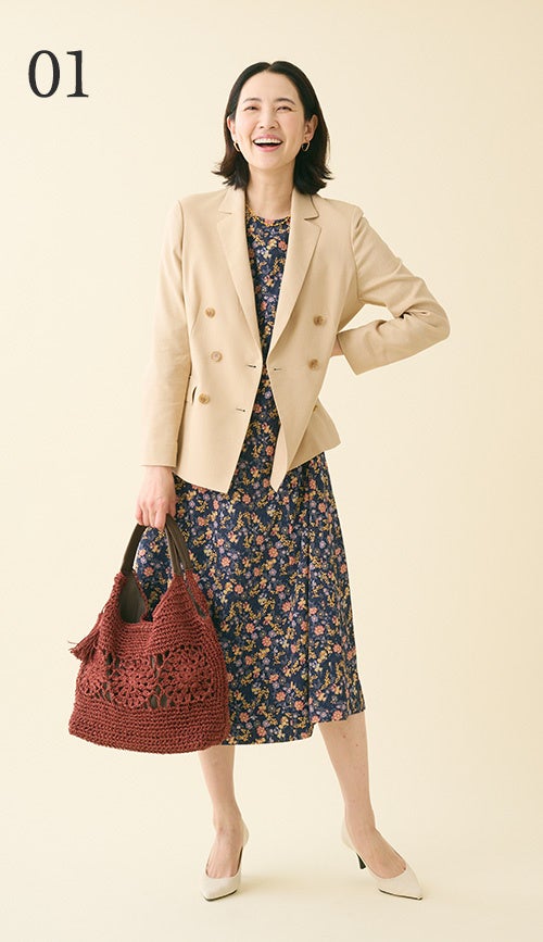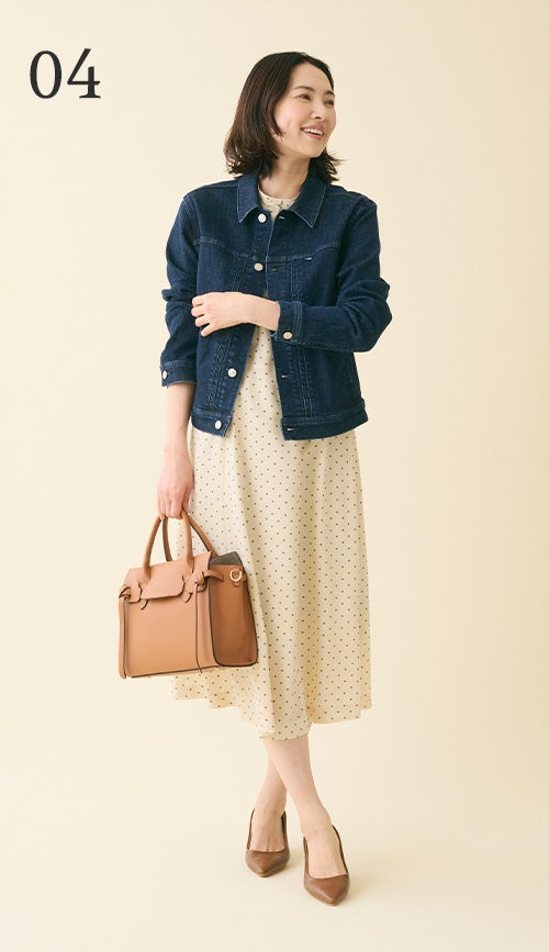 飽きのこないベーシックなデザインで、キレイめにもカジュアルにも様々なスタイリングで活躍してくれます。着用ワンピースは、【WEB限定】プリント小紋ワンピースになります。