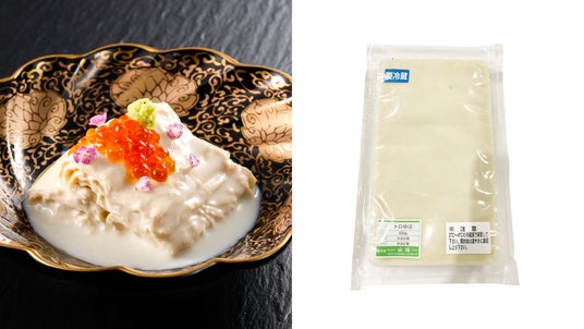 とろゆば加熱した豆乳の膜を1枚1枚手仕事で引き上げたクリーミーな生湯葉。和食・洋食・イタリアンなど、様々なお料理に合わせやすく前菜からデザートまで幅広くお使いいただけます。