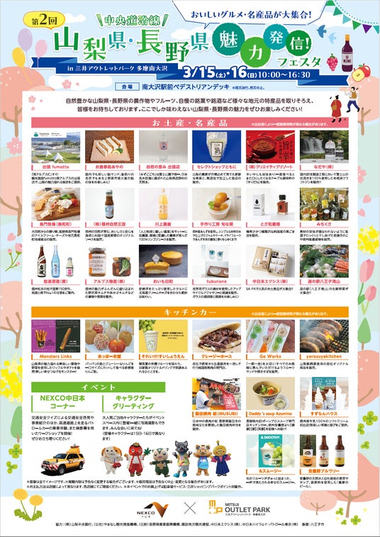 中日本高速道路株式会社八王子支社(東京都八王子市、支社長・村田 啓)は、2025年3月15日・16日にE20 中央自動車道(中央道)沿線地域の観光地・ご当地食品・有名土産品などの販売・PR を目的とした「中央道沿線(山梨県・長野県)魅力発信!フェスタ(第2回)」を、三井アウトレットパーク多摩南大沢で開催します。このイベントは、NEXCO 中日本の高速道路を通じた“沿線地域(自治体・銀行など)とのつながり”と、三井アウトレットパーク多摩南大沢の“集客力”というそれぞれの強みを生かすべくタッグを組み、山梨県・長野県の自治体・銀行と連携して実施するものです。地元の工芸品やご当地の味覚、歴史ある観光地などの溢れる魅力を一堂に集めて発信いたします。