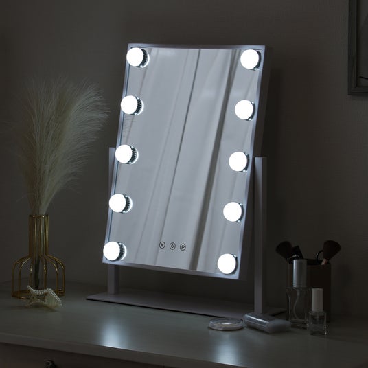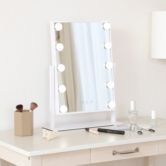 顔全体が映る大きくて見やすいサイズです。メイクからヘアセットまで、しっかり確認できます。また、イヤリングやネックレスの装着など顔周りのスタイリングも整えることができます。