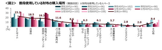 財布の購入場所は「ECサイト」が最も高く、「百貨店」「高級ブランド直営店・ブティック」が続く。