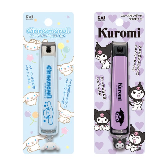 今回のコラボレーションでは、シナモロールとクロミのかわいいデザインのニュースタンダードツメキリにマスコットチャーム付き。持ち運びに便利なSサイズと手なじみの良いMサイズの2サイズの展開です。貝印は、ツメキリ国内シェアNo.1※でサイズ、形状、用途別に400種類以上を揃えています。今回のコラボレーション商品である「ニュースタンダードツメキリ」は、シャープな切れ味が特徴で、デザインの可愛さだけでなく実用性にも優れた商品です。