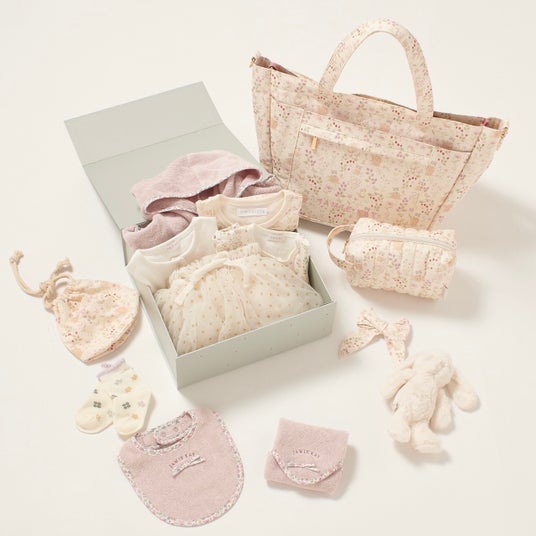 「はじめてのJAMIE KAY スペシャルセット」お子さまがそのまま着用してお出かけできるコーディネートセットから、おうちタイムに役立つバスローブやファーストトイ、お世話用品がしっかり入るペアレンツ向けトートバッグや、ヘアアクセサリ、ポーチなどの雑貨がセットになった豪華BOXセット。