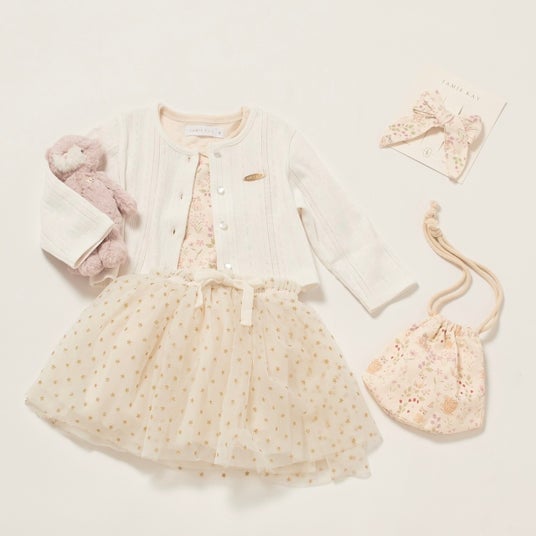 「はじめてのJAMIE KAY おでかけセット」カーディガンやチュチュ、20cmのぬいぐるみがセットになったおでかけセット。ハーフバースデーや1歳のお誕生日にもぴったりのコーディネートセットです。