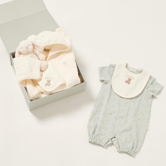 「はじめてのJAMIE KAY おうちセット」ねんねベビーがおうちの時間を快適に過ごせるセット。やさしい柄のカバーオールやバスローブ、20cmのぬいぐるみがセットになったコーディネートBOXです。