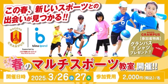 株式会社biima(東京・渋谷区/代表取締役:田村 恵彦、以下「biima」)は、日本プロサッカーリーグ(Jリーグ)所属の『名古屋グランパス』を運営する株式会社名古屋グランパスエイトと連携をし、複数のスポーツを体験できる「biima sports×名古屋グランパスコラボ企画:2025春のマルチスポーツ教室」を春休み限定で実施いたします。幼少期は神経系の発達が著しく向上する時期です。そのため運動能力の向上を目指し、サッカーに限らず様々なスポーツに触れる機会を創ることを目的として開催いたします。愛知県の子ども達にスポーツを体験できる機会を通じて、スポーツが好きになる機会を提供してまいります。
