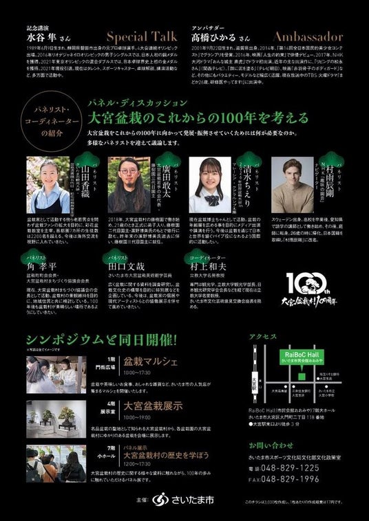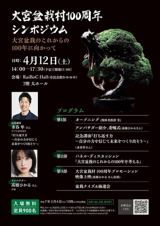 この大宮盆栽村100周年を皮切りに、盆栽に関心のある方はもちろん、盆栽の知識がない方にも大宮盆栽の魅力を知るきっかけにするため、令和7年4月12日に水谷隼さん(元プロ卓球選手)や高橋ひかるさん(俳優)らをゲストに迎え「大宮盆栽村100周年シンポジウム 大宮盆栽のこれからの100年に向かって」を開催します。