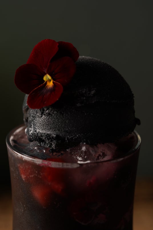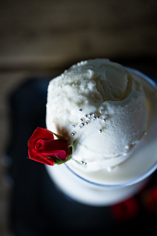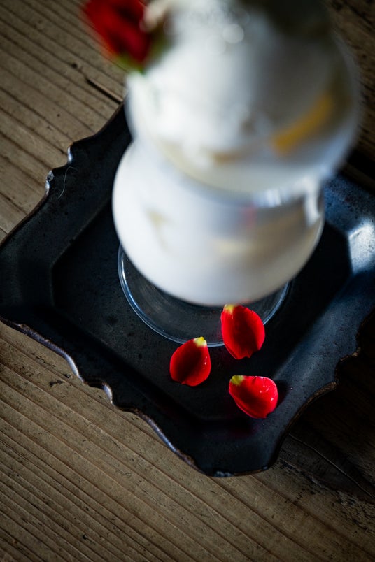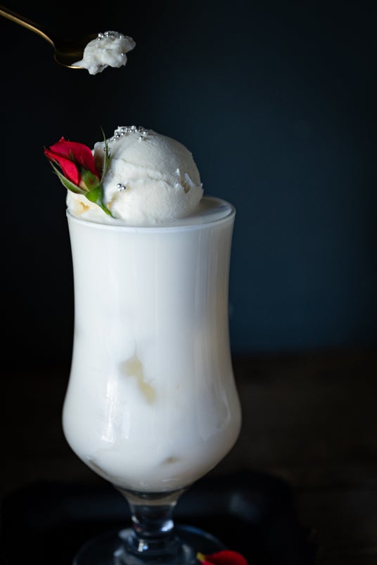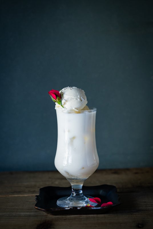 純白のビジュアルに、真っ赤な薔薇を一輪、贅沢に添えたコーヒーフロート。