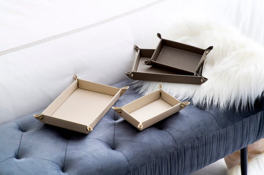 日常的に使うアイテムは、手に取りやすく収納できることが重要です。シーンに合わせて選んで使える2サイズのトレーセットは、インテリアに調和するカラーリングが特徴で、汚れや傷がつきにくいシュリンクレザー製。時計や眼鏡をベッドサイドにまとめたり、デスク上の筆記用具の整理、玄関での鍵の収納場所など、様々な場面で活躍します。
