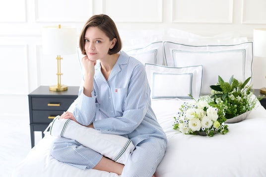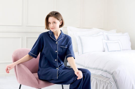 シャツ生地を使用したオープンカラーのテーラードパジャマセットという、オーセンティックなルームウェアをホテルライクインテリアらしく再構築しました。ゆったりとしたシルエットや生地の軽やかな質感は、リラックスタイムにふさわしい着心地を第一に考え、その上で適度にハリのある素材感が、袖を通すたびにすっきりとクリアなフィーリングをもたらします。ストライプのカラーリングに合わせた胸元の刺繍がポイントで、ギフトにも最適なアイテムです。表情の異なる2色のブルーをラインナップ。