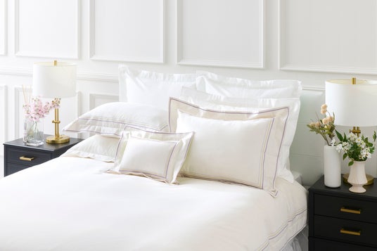 3本のカラーステッチが特徴のベッドリネンシリーズ。カラーバリエーションは、まろやかなアイボリーの生地を、パープルとゴールドの光沢ある刺繍が上品に引き締める「シスル」と、朝露のようにみずみずしいグリーンのグラデーションが、ホワイトリネンのクリーンさを一層引き立てる「バジル」の2色をご用意しました。ブドワール、ネックロールといった、ベッドコーディネートにさらに奥行きをもたらすクッションカバーも展開しています。