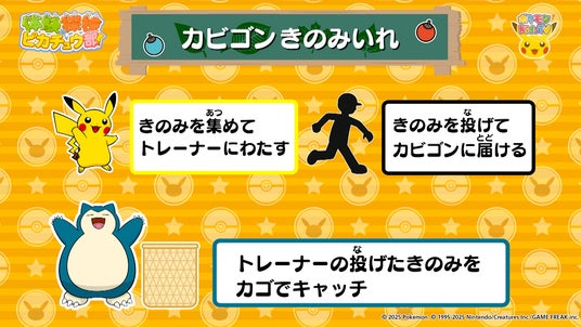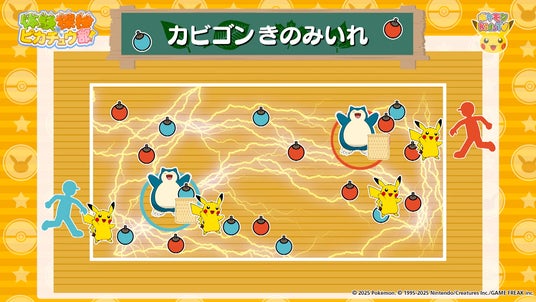 動きが素早く元気なピカチュウと、動きがゆっくりで食べることが大好きなカビゴン。そんな特徴のちがいを超えて、一緒に楽しく遊べるスポーツとして開発されました。『カビゴンきのみいれ』は、YouTubeチャンネル「ポケモン Kids TV」の「体験探検ピカチュウ部!」で実施されるほか、「ポケモン Kids TV」公式サイトでも紹介されています。