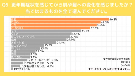 前の設問で更年期のケアをしている、と答えた541人に肌や髪の変化も聞いてみました。最も多かったのは「白髪 (46.2%)」でした。次いで「たるみ (42.3%)」「シミ (40.5%)」「ハリの低下 (37.3%)」という結果でした。