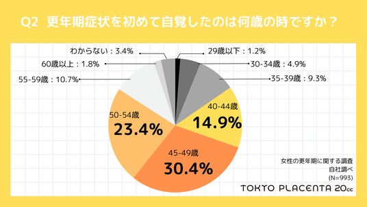 さらに「更年期症状を始めて感じた」年齢を聞いたところ、45-49歳33.4%と最も高いことが明らかになりました。個人差があるものの40代後半から50代前半で更年期症状を感じ始める方が多いようです。