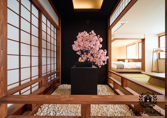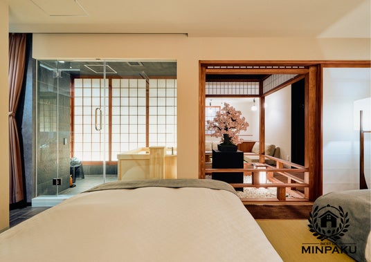 「BEST OF HOTEL MINPAKU 2025」一棟型民泊部門で第一位に輝いた「今昔荘 大阪 天保山 - 観桜・松柏 -」の寝室とお部屋風呂「BEST OF MINPAKU 2025」で受賞