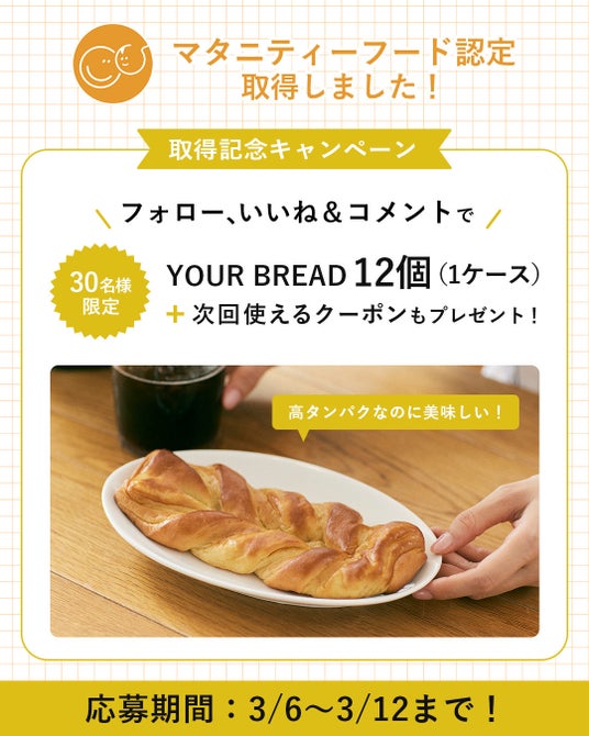 マッスルデリなどを運営する株式会社YOUR MEAL(本社:東京都港区、代表取締役社長CEO:須藤大輔、以下「ユアミール」)は、高タンパクなロングライフパン「YOUR BREAD(ユアブレッド)」が、一般社団法人日本マタニティフード協会より「妊娠に向けて準備を行っている時期および妊娠期から授乳期にある母体に配慮した食品」としてマタニティフード認定を取得したことをお知らせいたします。
