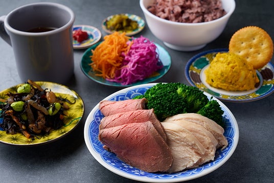 1日じっくり塩漬けし、低温調理で仕上げた豪州黒牛ローストビーフと備中高原鶏チキンブレストのこだわりのタンパク質をしっかり摂れるプレートです