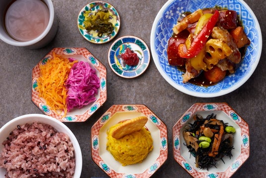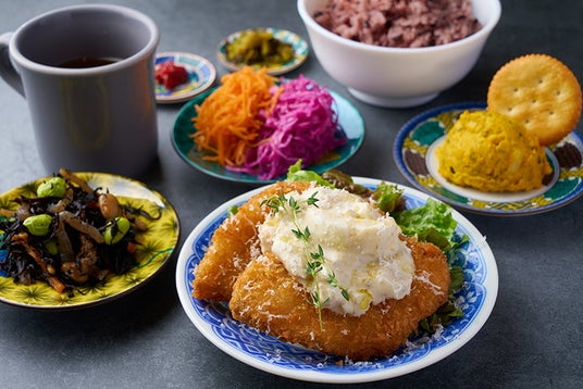 黒米ごはん、potto特製の能登のいしる出汁入り味噌汁、お野菜の副菜3種、そして選べるメイン料理(全6種)がついた、カラダにもココロにもうれしいお食事をお楽しみいただけます。