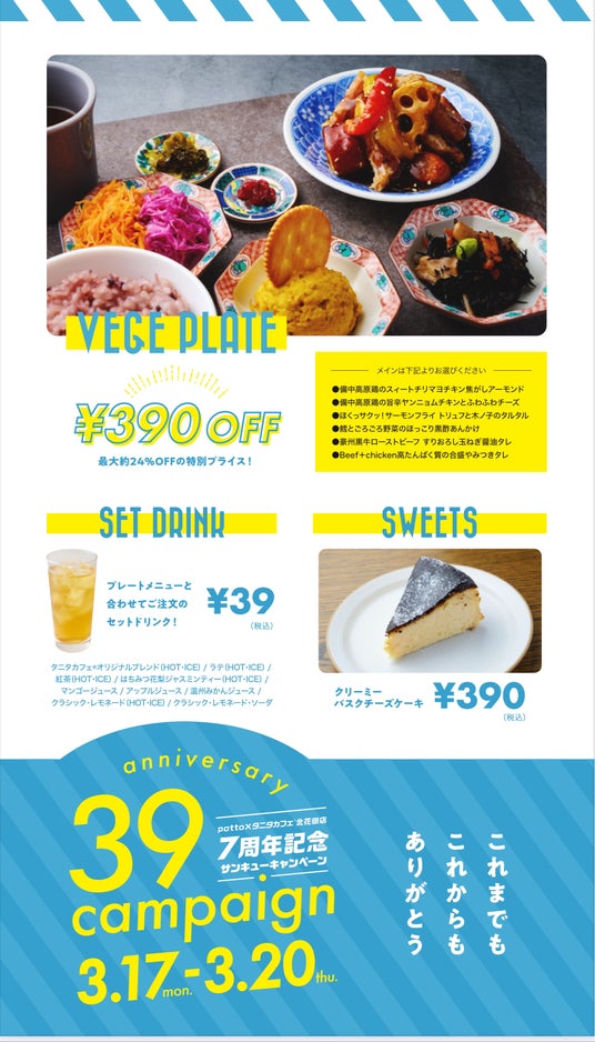 食堂カフェpotto、pasta gallery potto等を大阪府下8店舗展開する、株式会社have (本社:石川県加賀市) は、この度、食堂カフェpotto×タニタカフェ(R)イオンモール堺北花田店が3月20日に7周年を迎えるにあたり、【7周年の感謝を込めた特別な4日間】を開催いたします。