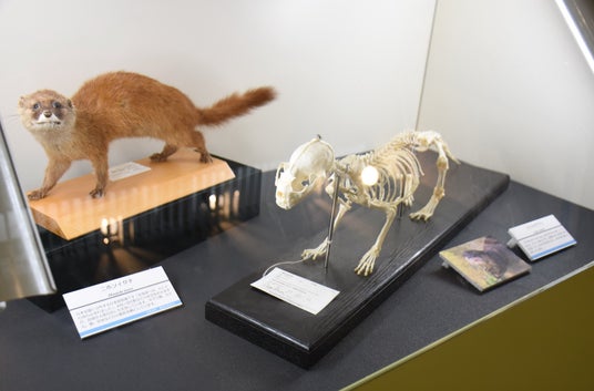 ラッコは食肉目イタチ科に属し、中でもカワウソ類に近縁な動物です。今回の展示では、イタチ科の動物で広く日本に分布しているニホンイタチのはく製と、カワウソ類の一種でのんほいパークでも飼育しているコツメカワウソの組立骨格も展示しています。