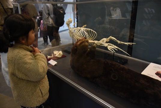 「ラッコを知るには生態や行動の観察だけではなく、体の形状や骨の形態を十分に調べる必要があります。そのため、死亡した飼育個体から作製した骨格標本やはく製は、野生個体からそれらを製作することができない現状において、非常に貴重な資料です」と今回の展示の企画者で主任学芸員の安井謙介さんは説明します。