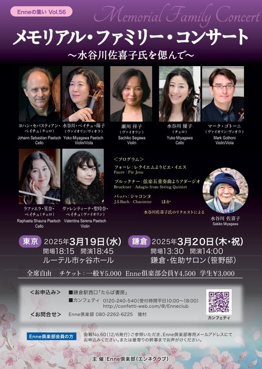 ベルリン芸大教授からロンドン・ロイヤルオペラハウス管弦団首席奏者はたまたベルリン・フィル最年少団員まで、全員が音楽一家に生まれ育った弦楽奏者という稀有なメンバー《近衞秀麿の孫(水谷川陽子・優子)曾孫(ラファエラ&バレンティナ・ペイチュ)を含む》がヨーロッパより結集して贈る壮大な『ファミリー・メモリアル・コンサート』。