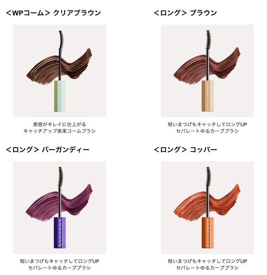 また、3650 マスカラの人気商品「WPコーム」に「クリアブラウン」が登場。「WPコーム」の特徴であるシアー発色に春にぴったりの柔らかいカラーが加わり、透明感はそのまま、気分に合わせて既存のクリアブラックとは異なる雰囲気をお楽しみいただけるようになりました。さらに、お湯オフが可能な「フィルムロング」シリーズには、「ブラウン」「バーガンディー」「コッパー」の3色が登場。仕上がりやオフの方法、カラーまで、お好みに合わせて幅広いラインナップからお選びいただけます。