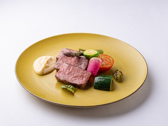 牛の塩麹漬け じゃがいもと麹ソースとトマト、季節の野菜を添えて