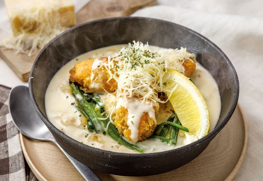 広島県産牡蠣を使った大ぶりの牡蠣フライと、相性の良いほうれん草をトッピング。濃厚チーズソースとふわっと削ったパルメザンチーズで仕上げました。とろけるチーズと広島ならではの味覚が楽しめる逸品です。