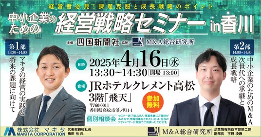 株式会社M&A総合研究所(本社:東京都千代田区、代表取締役社長:佐上 峻作、以下「当社」)は、2025年4月16日(水)に香川県高松市でM&A・事業承継に関するセミナーを実施いたします。