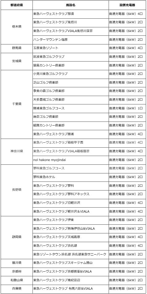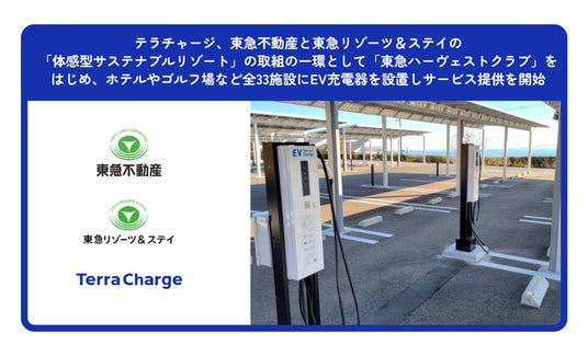 電気自動車(EV)向け充電サービス「Terra Charge(テラチャージ)」を展開するTerra Charge 株式会社(本社:東京都港区、代表取締役社長:徳重徹、以下「当社」)は、東急不動産株式会社(本社:東京都渋谷区、代表取締役社長:星野浩明、以下「東急不動産」)と東急リゾーツ&ステイ株式会社(本社:東京都渋谷区、代表取締役社長:粟辻 稔泰、以下「東急リゾーツ&ステイ」)とともに、「東急ハーヴェストクラブ」をはじめとするホテルやゴルフ場など全国33のリゾート施設へ6kW出力の普通充電器計52口を設置し、サービス提供を開始いたしましたのでお知らせいたします。