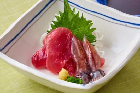 みずみずしさの中に旨味がある上品な味わいの“焼津産・枕崎産かつお”と、魚体が傷まない漁法で獲った鮮度が特徴の“富山県産ほたるいか”の刺身。