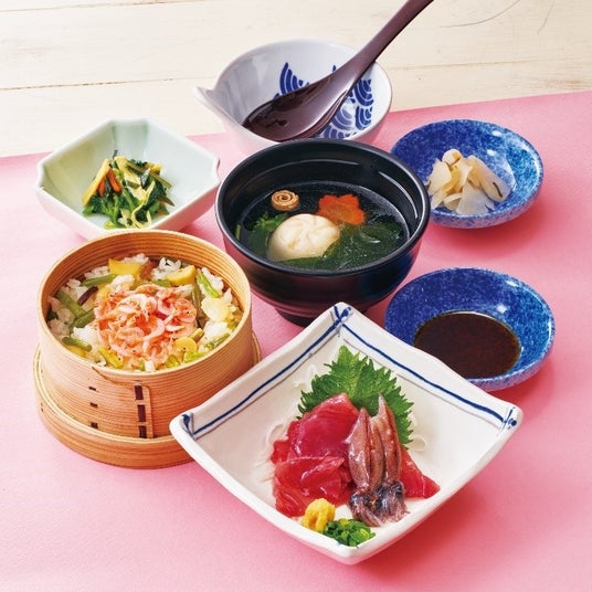 山菜と桜海老のおこわせいろ御膳 1,449円(税込1,594円)※画像は、かつおとほたるいかの刺身・海老しんじょうお吸い物