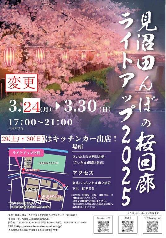 3月17日(月)からを予定していた「見沼田んぼの桜回廊 ライトアップ2025」について、桜の開花が遅れているため、ライトアップ開始日を3月24日(月)に延期します。