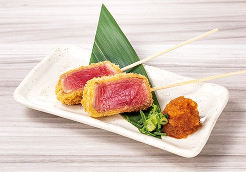 「静岡県焼津産 鰹」を食べやすい一串サイズのレアカツに!黄金の薄衣で包み、 外はサクッと、中はしっとりジューシーなレア食感に仕上げました。ガーリック醤油味の大根おろしと一緒にお楽しみください。