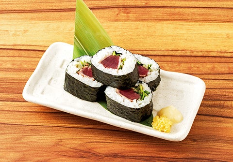 静岡県焼津産の鰹のたたきをみょうがや大葉などの薬味と一緒に巻きあげました。