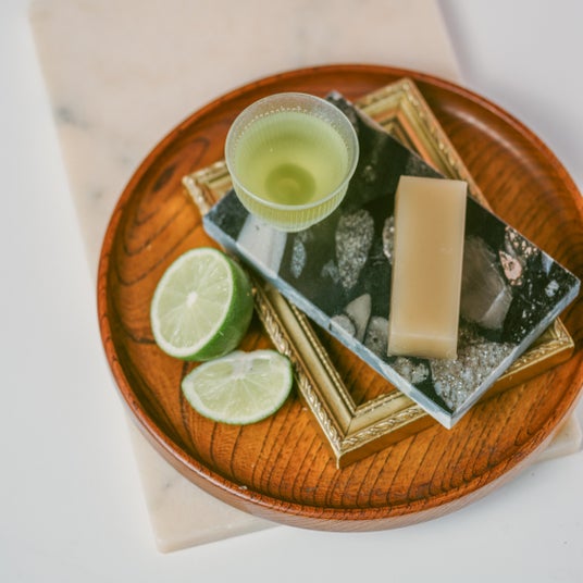濃く淹れた煎茶と白あんで羊羹を作り、ライムの果汁を加えました。煎茶の旨味、甘味、苦味にライムの爽やかな香りと酸味をアクセントにしています。