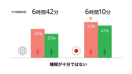日本は、調査対象の57の国・地域の中で、平均睡眠時間が最下位でした。よって日本の男女ともに睡眠が十分でないと感じている割合は世界平均よりも高く、さらに日本の女性は52%と半数を超えています。