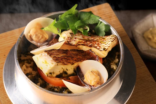 真鯛とはまぐり、焼きトマトのパエリア風釜飯