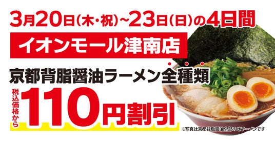 この度オープンを記念して、「イオンモール津南店」にご来店いただいたお客様には、『京都背脂醤油ラーメン全種類』を税込価格から110円割引で販売いたします。