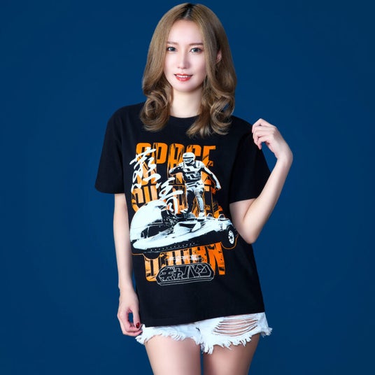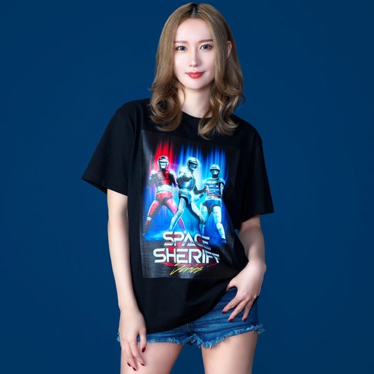 宇宙刑事、ここに結集!漆黒のボディに輝く、ギャバン、シャリバン、シャイダーのメタルヒーローを、鮮やかなフルカラーで完全再現!メタリックな「SPACE SHERIFF」のロゴが眩しい、懐かしい味わいも感じるデザイン!まさに宇宙刑事オフィシャルTシャツにふさわしい逸品だ。
