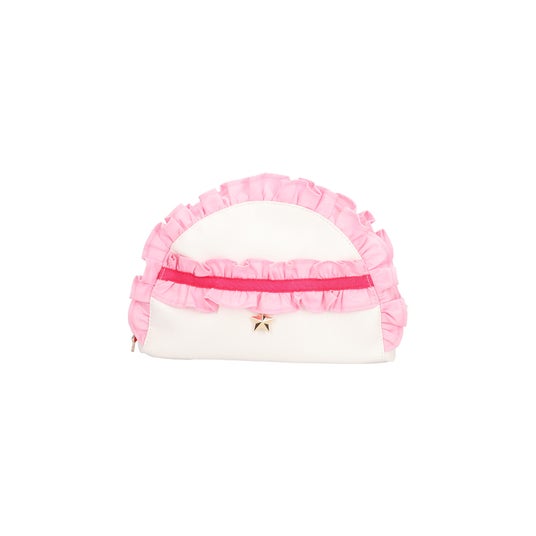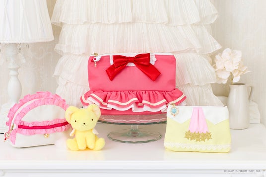 クロウカード編、さくらカード編、クリアカード編の各コスチュームをイメージしたデザインのポーチには、それぞれ「封印の鍵」「星の鍵」「夢の鍵」のキーチャームが付属しています。フリルの大きさや刺しゅう、内側の総柄デザインにもこだわった一品です。