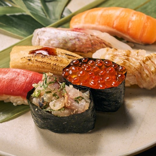 「七福握り」1,777円(税込)七福神を思わせる縁起の良い「一角のお寿司」(7貫:中トロ・サーモン・鯛・炙りえんがわ・鯵のたたき・穴子・いくら)です。3月29日(土),30日(日)の2日間、各日20食限定。