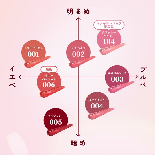 2024年3月に発売した『アップトゥーミー』の「ハグマイリップ」は、水滴のようなぷるんとしたツヤ感を叶えるリキッドタイプのリップカラーです。マツモトキヨシグループ・ココカラファイングループで先行発売したところ、プランプ効果※1、ロングラスティング効果など機能性の高さが若年層を中心に支持され、計画を上回る売上実績となり、このたび、全国のドラッグストア(一部店舗除く)で展開することになりました。今回発売する「ハグマイリップ」の新色は、トレンドである、明るくて活気のあるカラーです。プランプ※1効果、さらにティント効果や色移りしにくいジェル膜処方などの多機能性により、つけたての発色を長くお楽しみいただけます。