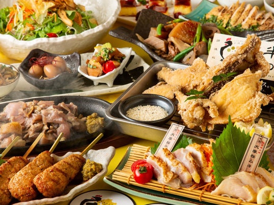鶏のタタキや半身唐揚げ、鶏もも炭火焼など全9品、歓送迎会などの宴会におすすめの2時間飲み放題付の人気プランです。