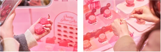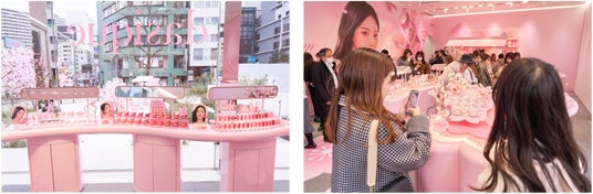 朝11時のオープンとともに、この日を待ち望んでいた多くの来場者で賑わいを見せました。正面には、約4mもの巨大な桜モニュメントと「Pink Blossom」コレクションのアイコンでもあるアイシャドウパレット「ラブブロッサム」、「ブルーミングシャドウ」、「ピュアウォーターリップグロス」のオブジェが来場者をお出迎え。足を踏み入れた途端、「dasique」ならではの乙女心をくすぐる世界観が体験できるポップアップストアに「可愛い!」という歓声をあげ、記念撮影をする来場者の姿が多くみられました。
