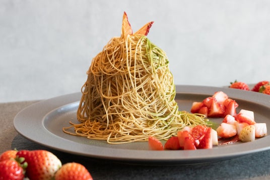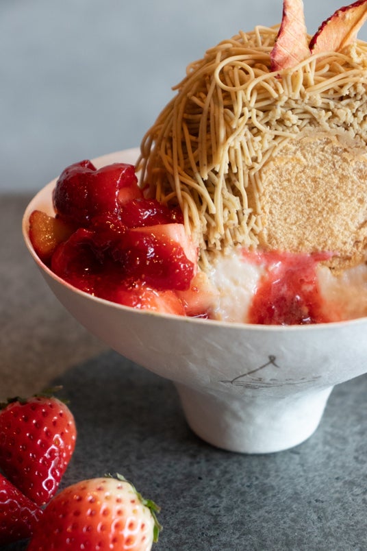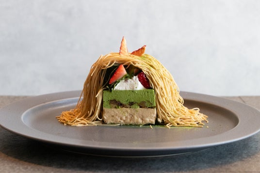 旬の苺と、香り豊かな抹茶のムースを合わせたモンブランケーキ。抹茶のほろ苦さと、苺の甘酸っぱさ、さらに和栗の甘みが調和する味わいに魅了されます。