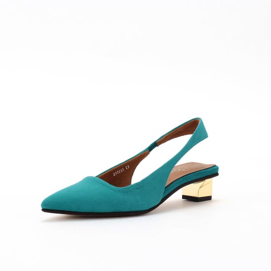 ピーコックグリーンのスエードに、イエローゴールドのメタリックヒールが輝き、華やかさとトレンド感をプラス。