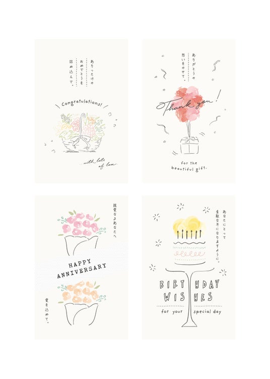 メッセージカードは4種類ご用意しており、ケーキのお渡し時にお好きなデザインをお選びいただけます。大切な方へのお祝いの気持ちを添えて、特別なケーキをより一層華やかに演出いたします。